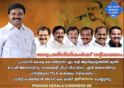 കെ എം മാണി സാറിന്റെ മരണശേഷം കേരളാ കോണ്ഗ്രസ് പാര്ട്ടിയിലുണ്ടായ പ്രശ്നങ്ങളില് അടിപതറാതെ പാര്ട്ടിയെ ഉള്ളംകൈയ്യിലെന്നപോലെ കാത്തുസൂക്ഷിക്കുകയും , പ്രസ്ഥാനത്തിന് ഒരു കോട്ടം തട്ടാതെയും , പാര്ട്ടി പ്രവര്ത്തകരുടെ ആത്മവീര്യം ചോരാതെയും ,മുഴുവന് കേരളാ കോണ്ഗ്രസ് പ്രവര്ത്തകരെയും വിശ്വാസത്തിലെടുത്തു എല്ഡി എഫ് മുന്നണിയില് ചേരാന് രാഷ്ട്രീയ തീരുമാനമെടുക്കുകയും ചെയ്ത കേരളാ കോണ്ഗ്രസ് നേതാക്കന്മാര്ക്ക് ഈ മാസം 26 നു വൈകുന്നേരം യു കെ സമയം അഞ്ചുമണിയ്ക്കു (ഇന്ത്യന് സമയം ഒന്പതര മണി ) ഓണ്ലൈന് പ്ലാറ്റ്ഫോമില് കൂടി സ്വീകരണം നല്കുമെന്ന് പ്രവാസി കേരളാ കോണ്ഗ്രസ് യു കെ ഘടകം പ്രസിഡന്റ് ഷൈമോന് തോട്ടുങ്കല് , ജനറല് സെക്രട്ടറി ടോമിച്ചന് കൊഴുവനാല് , സി എ ജോസഫ് ,മാനുവല് മാത്യു , ജിജോ അരയത് ,ബിനു മുപ്രാപ്പള്ളില് , ബെന്നി അമ്പാട്ട് , ജോഷി അയര്ക്കുന്നം, നാഷണല് എക്സിക്യൂട്ടീവ് കമ്മിറ്റി അംഗങ്ങളായ ജയ്മോന് വഞ്ചിത്താനം , ഷാജി വാരക്കുടി , ജോബിള് വൂസ്റ്റര് , ജിജി വരിക്കാശ്ശേരി , വിനോദ് ചുങ്കക്കാരോട്ട് എന്നിവര് അറിയിച്ചു .