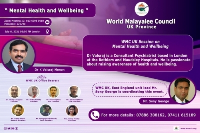 വേള്ഡ് മലയാളി കൗണ്സില് യുകെ ഒരുക്കുന്ന 'മെന്റല് ഹെല്ത്ത് അന്റ് വെല്ബിയിങ്ങ് 'ക്ലാസ്സ് ജൂലൈ 6ന് വൈകുന്നേരം 6മണിക്ക് സൂം പ്ലാറ്റ്ഫോമിലൂടെ. ലണ്ടനിലെ പ്രമുഖ സൈകൃാര്ട്ടിസ്റ്റ് കണ്സല്ടെന്റായി ജോലി ചെയ്യുന്ന ഡോ : വത്സരാജ് മേനോന് ആണ് ക്ലാസ്സ് നയിക്കുന്നത്. ഈ പ്രോഗ്രാമിലേക്ക് എല്ലാവരെയും വേള്ഡ് മലയാളി കൌണ്സില് ഭാരവാഹികള് ഹാര്ത്ഥമായി സ്വാഗതം ചെയ്യുന്നു.