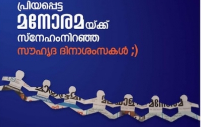 പ്രിയപ്പെട്ട മനോരമയ്ക്ക് സ്നേഹം നിറഞ്ഞ സൗഹൃദ ദിനാശംസകള് എന്നാണ് എഴുതിയിരിക്കുന്നത്. സൗഹൃദ ദിനത്തില് ആളുകള് പരസ്പരം സൗഹൃദ ദിനം ആശംസിക്കുന്ന അവസരത്തിലാണ് മലയാളത്തിലെ മുഖ്യധാര പത്രങ്ങളും ചര്ച്ചയായി മാറിയിരിക്കുന്നത്.