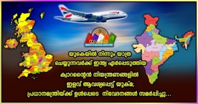 യു കെ യില് നിന്നും ഇന്ത്യയിലേയ്ക്ക് യാത്ര ചെയ്യുന്നവര്ക്ക് ഇന്ത്യ ഗവണ്മെന്റ് പുതുതായി ഏര്പ്പെടുത്തിയ ക്വാറന്റൈന് നിയന്ത്രണങ്ങളില് ഇളവ് നല്കണമെന്നാവശ്യപ്പെട്ട് യുക്മ നേതൃത്വം പ്രധാനമന്ത്രി നരേന്ദ്ര മോദി, വിദേശകാര്യ മന്ത്രി എസ്. ജയശങ്കര്, ആരോഗ്യ മന്ത്രി മന്സൂഖ് മാന്ഡവിയ എന്നിവര് ഉള്പ്പടെയുള്ള ഉന്നതാധികാരികള്ക്ക് നിവേദനം സമര്പ്പിച്ചു.