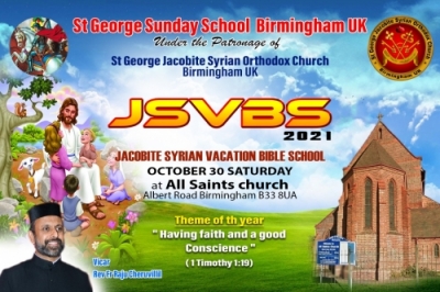 'ഇംഗ്ലണ്ടിലെ പുതുപ്പള്ളിപ്പള്ളി' എന്നപേരില് അറിയപ്പെടുന്ന ബിര്മിങ്ങ്ഹാം സെന്റ് ജോര്ജ് യാക്കോബായ സുറിയാനി ഓര്ത്തഡോക്സ് പള്ളിയില് കുട്ടികളുടെ അല്മിയ ഉന്നമനത്തിനായി ദൈവ വചനം പഠിക്കുന്നതിനും എല്ലാ വര്ഷവും നടത്തി വരാറുള്ള ജെ എസ് വി ബി എസ് ഈ വര്ഷവും 30നു ബര്മിങ്ങ്ഹാം സ്റ്റെച്ച്ഫോര്ഡിലുള്ള ഓള് സെയിന്റസ് ചര്ച്ചില് വെച്ചു നടത്തപ്പെടുന്നു.