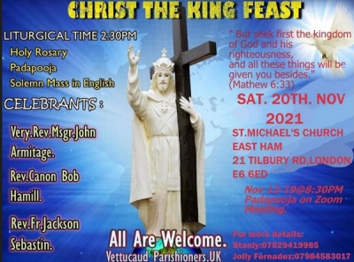 ഈസ്റ്റ് ഹാമിലെ സെന്റ് മൈക്കല്സ് ദേവാലയത്തില്വെച്ച് നവംബര് ഇരുപതാം തിയതി ഉച്ചക്ക് 2.30 ന് ഈ വര്ഷത്തെ ക്രിസ്തു രാജത്വ തിരുനാള് ആഘോഷ പൂര്വ്വം നടത്തപ്പെടും.