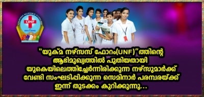 'യുകെയിലെ മലയാളി നഴ്സുമാരോടൊപ്പം ചേര്ന്ന് നില്ക്കുകയും, പിന്തുണയ്ക്കുകയും അവരുടെ വിവിധ പ്രശ്നങ്ങള് പരിഹരിക്കുന്നതിന് മുന്നണിപ്പോരാളികളായി പോരാടുകയും ചെയ്യുന്ന 'യുക്മ നഴ്സസ് ഫോറം(UNF)' ത്തിന്റെ ആഭിമുഖ്യത്തില് പുതിയതായി യുകെയിലെത്തിച്ചേര്ന്നിരിക്കുന്ന മലയാളികള് ഉള്പ്പെടുന്ന നഴ്സുമാര്ക്ക് വേണ്ടി സംഘടിപ്പിക്കുന്ന വെബ് സെമിനാര് പരമ്പരയ്ക്ക് ഇന്ന് (ശനിയാഴ്ച) തുടക്കം കുറിക്കുന്നു.