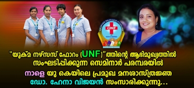 യുക്മയുടെ പോഷക സംഘടനയായ യുക്മ നഴ്സസ് ഫോറം (UNF) യുകെയിലെ മലയാളി നഴ്സുമാര്ക്ക് വേണ്ടി നിരവധിയായ പ്രശ്നങ്ങളില് അവരോടൊപ്പം ചേര്ന്ന് പ്രവര്ത്തിക്കുകയും, അവര്ക്ക് എല്ലാ വിധത്തിലുമുള്ള പിന്തുണ നല്കുകയും ചെയ്തു വരുന്നു. നഴ്സുമാരുടെ വിവിധ പ്രശ്നങ്ങള് ഗവണ്മെന്റിന് മുന്നില് എത്തിക്കുകയും, പ്രശ്നങ്ങള് പരിഹരിക്കുന്നതിന് മുന്നണിപ്പോരാളികളായി പോരാടുകയും ചെയ്യുന്ന 'യുക്മ നഴ്സസ് ഫോറം(UNF)' ത്തിന്റെ ആഭിമുഖ്യത്തില് നഴ്സുമാര്ക്ക് വേണ്ടി സംഘടിപ്പിക്കുന്ന വെബ് സെമിനാര് പരമ്പരയ്ക്ക് 15 ന് ആണ് തുടക്കം കുറിച്ചത്.