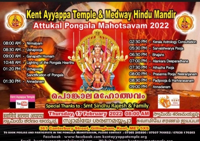 ഫെബ്രുവരി 17നു വ്യാഴാഴ്ച രാവിലെ ഒമ്പതു മണിക്ക് പൂജാദികര്മ്മങ്ങള് ആരംഭിക്കും. നൂറുകണക്കിന് ആറ്റുകാല് ഭഗവതി ഭക്തര് ഇത്തവണ യു കെ യുടെ നാനാ ഭാഗങ്ങളില് നിന്നും ന്യുഹാമിലെ ശ്രീ മുരുകന് ക്ഷേത്രത്തില് എത്തിച്ചേരുമെന്നാണ് സംഘാടക സമിതി കണക്കാക്കുന്നത്.
