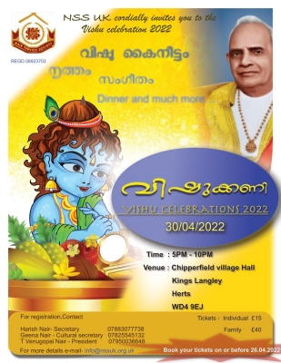 എന്എസ്എസ് യുകെ വിഷുക്കണി ആഘോഷം ഏപ്രില് 30 ന് .ചിപ്പര്ഫീല്ഡ് വില്ലേജ് ഹാളില് വൈകീട്ട് അഞ്ചു മുതല് 10 വരെ നടത്തും. ടിക്കറ്റിന് 15 പൗണ്ടും കുടുംബത്തിന് 40 പൗണ്ടുമാണ് നിരക്ക്. 26ന് മുമ്പേ ടിക്കറ്റ് ബുക്ക് ചെയ്യുക. കൂടുതല് വിവരങ്ങള്ക്ക് ഹരീഷ് നായര് (സെക്രട്ടറി) ; 07883077738