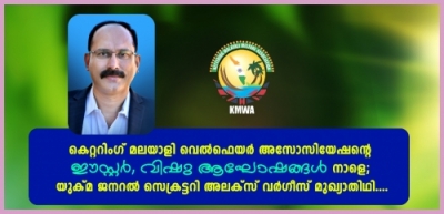 മിഡ്ലാന്ഡ്സിലെ പ്രമുഖ മലയാളി അസോസിയേഷനുകളിലൊന്നും കെറ്ററിങ്ങിലെ മലയാളികളുടെ കൂട്ടായ്മയുമായ കെറ്ററിംഗ് മലയാളി വെല്ഫെയര് അസോസിയേഷന്റെ ഈസ്റ്റര് വിഷു ആഘോഷങ്ങള് നാളെ (ശനിയാഴ്ച) കെറ്ററിംഗ് ബക്കളു അക്കാഡമി സ്കൂളിന്റെ സ്പോര്ട്സ് ഹാളില് വെച്ചു നടക്കുന്നു. അസോസിയേഷന് പ്രസിഡന്റ് സിബു ജോസഫ് അദ്ധ്യക്ഷത വഹിക്കുന്ന ചടങ്ങില് യുക്മ നാഷണല് ജനറല് സെക്രട്ടറി അലക്സ് വര്ഗീസ് മുഖ്യാതിഥിയാകും. സെക്രട്ടറി സൈബു തോമസ് പരിപാടിക്ക് സ്വാഗതം ആശംസിക്കും. ട്രഷറര് പ്രബീഷ് വാസുദേവന് നന്ദി പ്രകാശിപ്പിക്കും.