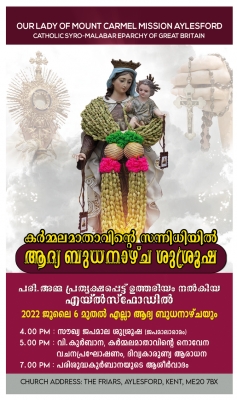 വിശ്വാസികളുടെ പങ്കാളിത്തം കൊണ്ട് ഏറെ പ്രചാരം നേടിയ എയ്ല്സ്ഫോര്ഡ് മരിയന് തീര്ത്ഥാടനത്തിന് ശേഷം കര്മ്മലമാതാവിന്റെ സംരക്ഷണഭൂമിയിലേക്ക് ഗ്രേറ്റ് ബ്രിട്ടന് സീറോ മലബാര് രൂപതയുടെ ആഭിമുഖ്യത്തില് ആദ്യബുധനാഴ്ച ശുശൂഷ ആരംഭിക്കുന്നു. ജൂലൈ 6 മുതല് എല്ലാ ആദ്യബുധനാഴ്ചകളിലുമായി ക്രമീകരിച്ചിരിക്കുന്ന ശുശ്രൂഷയ്ക്ക് എയ്ല്സ്ഫോര്ഡിലെ സീറോ മലബാര് മിഷന് നേതൃത്വം നല്കും. പരിശുദ്ധ കന്യാമറിയം വിശുദ്ധ സൈമണ് സ്റ്റോക്കിന് പ്രത്യക്ഷപ്പെട്ട് ഉത്തരീയം (വെന്തിങ്ങ) നല്കിയ പുണ്യഭൂമിയും, ലോകമെമ്പാടുമുള്ള മരിയഭക്തരുടെ ആത്മീയ സങ്കേതവുമാണ് എയ്ല്സ്ഫോര്ഡ്.