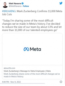 ''മെറ്റയുടെ ചരിത്രത്തില് ഞങ്ങള് വരുത്തിയ ഏറ്റവും പ്രയാസകരമായ മാറ്റങ്ങളില് ചിലത് ഇന്ന് ഞാന് പങ്കിടുന്നു. ഞങ്ങളുടെ ടീമിന്റെ വലുപ്പം ഏകദേശം 13% കുറയ്ക്കാനും ഞങ്ങളുടെ കഴിവുള്ള 11,000-ത്തിലധികം ജീവനക്കാരെ പോകാന് അനുവദിക്കാനും ഞാന് തീരുമാനിച്ചു' |