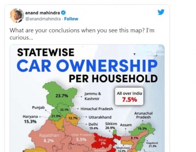 കഴിഞ്ഞ ദിവസം മഹീന്ദ്ര ആന്ഡ് മഹീന്ദ്ര ഗ്രൂപ്പ് ചെയര്മാന് ആനന്ദ് മഹീന്ദ്ര പുറത്തുവിട്ട ചാര്ട്ടിലാണ് ഈ വിവരം പുറത്തുവിട്ടത്. ഇന്ത്യയിലെ 7.5 ശതമാനം വീടുകളിലും കാറുകള് ഉണ്ട്. അതായത് 12 പേരില് ഒരാള്ക്ക് കാര് ഉണ്ടാകുമെന്നാണ് വിലയിരുത്തലുകള്. 2019 മുതല് 2021 വരെയുള്ള കാലഘട്ടത്തിലെ നാഷണല് ഫാമിലി ഹെല്ത്ത് സര്വേയുടെ ഫലത്തിന്റെ അടിസ്ഥാനത്തിലാണ് അദ്ദേഹം ഇക്കാര്യം സാമൂഹിക മാധ്യമങ്ങളില് പ്രസിദ്ധികരിച്ചിരിക്കുന്നത്.