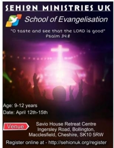 കുട്ടികള്ക്കായി സെഹിയോന് യുകെ മിനിസ്ട്രിയുടെ നേതൃത്വത്തില് സ്കൂള് ഓഫ് ഇവാഞ്ചലൈസേഷന് സ്കൂള് അവധിക്കാലത്ത് ഏപ്രില് 12 മുതല് 15 വരെ മാഞ്ചെസ്റ്റെറിനടുത്ത് മക്ലസ്ഫീല്ഡ് സാവിയോ ഹൗസില് നടക്കുന്നു.