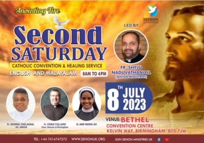ബര്മിങ്ഹാം ബെഥേല് സെന്റെറില് നടക്കുന്ന കണ്വെന്ഷന് ഫാ. ഷൈജു നടുവത്താനിയില് നയിക്കും. ബര്മിങ്ഹാം അതിരൂപത വൈദികന് ഫാ.ക്രൈഗ് ഫുള്ളാര്ഡ് ഇംഗ്ലീഷ് കണ്വെന്ഷനില് പങ്കുചേരും. 2009ല് ഫാ. സോജി ഓലിക്കല് തുടക്കമിട്ട സെഹിയോന് യുകെ രണ്ടാം ശനിയാഴ്ച്ച കണ്വെന്ഷന് 2023 മുതല് ഫാ സേവ്യര് ഖാന് വട്ടായിലിന്റെ ആത്മീയ നേതൃത്വത്തില് അഭിഷേകാഗ്നി എന്ന പേരിലാണ് പതിവുപോലെ എല്ലാ രണ്ടാം ശനിയാഴ്ച്ചകളിലും നടത്തപ്പെടുന്നത്.