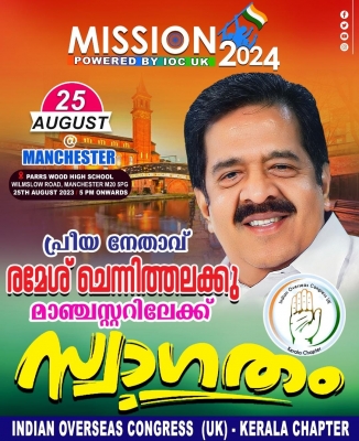 ഐഒസി യുകെ കേരള ചാപ്റ്ററിന്റെ നേതൃത്വത്തില് 'മിഷന് 2024' പ്രവാസി സംഗമം ഓഗസ്റ്റ് 25 (വെള്ളിയാഴ്ച) ന് വൈകുന്നേരം 5 മുതല് മഞ്ചസ്റ്ററില് നടക്കും. യുകെ യിലെ വിവിധ ഭാഗങ്ങളില് നിന്നും എത്തിച്ചേരുന്ന പ്രവാസി മലയാളി സമൂഹത്തെ അഭിസംബോധന ചെയ്തുകൊണ്ട് കോണ്ഗ്രസ് പാര്ട്ടിയുടെ ദേശീയ നേതാവും മുന് കെപിസിസി അധ്യക്ഷനും ആഭ്യന്തര മന്ത്രിയുമായിരുന്ന രമേശ് ചെന്നിത്തല ചടങ്ങ് ഉത്ഘാടനം ചെയ്യും.