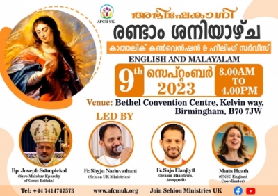 ദേശ ഭാഷാ വ്യത്യാസമില്ലാതെ അനേകര് പങ്കെടുക്കുന്ന ,ജപമാല , വി. കുര്ബാന,വചന പ്രഘോഷണം, ആരാധന, ദിവ്യ കാരുണ്യ പ്രദക്ഷിണം എന്നിവ ഉള്പ്പെടുന്ന അഭിഷേകാഗ്നി കണ്വെന്ഷനിലേക്ക് ,അഭിഷേകാഗ്നി യുകെ മിനിസ്ട്രിയുടെ നേതൃത്വം ഫാ ഷൈജു നടുവത്താനിയിലും AFCM യുകെ കുടുംബവും ഏവരെയും ക്ഷണിക്കുന്നു.
