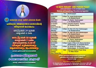 മാഞ്ചസ്റ്റര് സെന്റ് മേരീസ് ക്നാനായ കാത്തലിക് മിഷനില് ഇടവക മധ്യസ്ഥയായ പരിശുദ്ധ അമലോത്ഭവ മാതാവിന്റെ തിരുനാള് ഒക്ടോബര് 8 ശനിയാഴ്ച ഭക്തിപൂര്വ്വം ആഘോഷിക്കും. തിരുന്നാളി തിരുന്നാളിന്ന് ഒരുക്കമായി സെപ്റ്റംബര് 29 മുതല് ഓക്ടോബര് 7വരെ മിഷനിലെ വിവിധ കൂടാരയോഗങ്ങളുടെയും വിവിധ ഭക്തസംഘടനകള്, മതബോധന വിദ്യാര്ത്ഥികള്, അദ്ധ്യാപകര് തുടങ്ങിയവരുടെ നേതൃത്വത്തില് സെന്റ്. എലിസബത്ത് ദേവാലയത്തില് വച്ച് വൈകുന്നേരം 6:30ന് വിശുദ്ധ കുര്ബാനയും ദിവ്യകാരുണ്യ ആരാധനയും ജപമാലയും ഉണ്ടായിരിക്കുന്നതാണ്. പ്രധാന തിരുനാള് ദിവസമായ ഒക്ടോബര് 8 ഞായറാഴ്ച നോര്ത്തേന്ഡന് സെന്റ് ഹില്ഡാസ് ദേവാലയത്തില് വച്ച് രാവിലെ 10 ന് തിരുനാള് കൊടിയേറ്റം നടക്കും. തുടര്ന്ന് 10.30 ന് ആഘോഷമായ തിരുനാള് റാസകുര്ബാനയും സ്നേഹവിരുന്നും നടത്തപ്പെടും.
