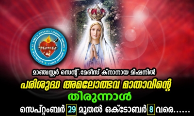 മാഞ്ചസ്റ്റര് സെന്റ് മേരീസ് ക്നാനായ കാത്തലിക് മിഷനില് ഇടവക മധ്യസ്ഥയായ പരിശുദ്ധ അമലോത്ഭവ മാതാവിന്റെ തിരുനാള് ഒക്ടോബര് 8 ശനിയാഴ്ച ഭക്തിപൂര്വ്വം ആഘോഷിക്കും. തിരുന്നാളി തിരുന്നാളിന്ന് ഒരുക്കമായി സെപ്റ്റംബര് 29 മുതല് ഓക്ടോബര് 7വരെ മിഷനിലെ വിവിധ കൂടാരയോഗങ്ങളുടെയും വിവിധ ഭക്തസംഘടനകള്, മതബോധന വിദ്യാര്ത്ഥികള്, അദ്ധ്യാപകര് തുടങ്ങിയവരുടെ നേതൃത്വത്തില് സെന്റ്. എലിസബത്ത് ദേവാലയത്തില് വച്ച് വൈകുന്നേരം 6:30ന് വിശുദ്ധ കുര്ബാനയും ദിവ്യകാരുണ്യ ആരാധനയും ജപമാലയും ഉണ്ടായിരിക്കുന്നതാണ്.
