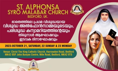 വിശുദ്ധ അല്ഫോന്സാമ്മയുടെ നാമധേയത്തിലുള്ള ബെഡ്ഫോര്ഡ് സെന്റ് അല്ഫോന്സാ പ്രോപോസ്ഡ് മിഷനില് പരിശുദ്ധ ദൈവമാതാവിന്റെയും, ഇടവക മദ്ധ്യസ്ഥയായ വിശുദ്ധ അല്ഫോന്സാമ്മയുടെയും സംയുക്ത തിരുന്നാളും, ഇടവക ദിനാഘോഷവും ഈ മാസം 21, 22, 23 തീയതികളിലായി കൊണ്ടാടുന്നു. ഈമാസം 13 മുതല് ആരംഭിക്കുന്ന ദശദിന ജപമാല സമര്പ്പണവും വിശുദ്ധ അല്ഫോന്സാമ്മയുടെ നൊവേനയും 22 നു നടക്കുന്ന മുഖ്യ തിരുന്നാളോടെ സമാപിക്കും. 21ന് ശനിയാഴ്ച രാവിലെ 10 മണിക്ക് ഇടവക വികാരി ഫാ.എബിന് നീരുവേലില് തിരുനാളിന് ആമുഖമായി കൊടിയേറ്റി വി. കുര്ബ്ബാന അര്പ്പിക്കും. പ്രധാന തിരുന്നാള് ദിനമായ 22ന് ഞായറാഴ്ച ഉച്ചകഴിഞ്ഞു മൂന്നു മണിക്ക് അര്പ്പിക്കുന്ന ആഘോഷപൂര്വ്വമായ സമൂഹബലിക്ക് ഗ്രേറ്റ് ബ്രിട്ടന് രൂപതയുടെ അഭിവന്ദ്യ അദ്ധ്യക്ഷന് മാര് ജോസഫ് സ്രാമ്പിക്കല് മുഖ്യകാര്മ്മികത്വം വഹിച്ചു സന്ദേശം നല്കും. തുടര്ന്ന് ദേവാലയം ചുറ്റി നടത്തുന്ന പ്രദക്ഷിണം പ്രധാന വേദിയായ ജോണ് ബനിയന് സെന്ററില് സമാപിക്കും. ഇടവക ദിനാഘോഷത്തില് നടക്കുന്ന പാരീഷ് ഭക്ത സംഘടനകളുടെയും, സണ്ഡേ സ്കൂളിന്റെയും വാര്ഷികത്തില് ബിബിളിക്കല് സ്കിറ്റും, കലാ പരിപാടികളും അരങ്ങേറും. തിരുന്നാള് കമ്മിറ്റിയുടെ നേതൃത്വത്തില് സ്നേഹവിരുന്നും ക്രമീകരിച്ചിട്ടുണ്ട്. തിരുന്നാള് സമാപന ദിനമായ 23ന് തിങ്കളാഴ്ച മരിച്ച വിശ്വാസികളുടെ തിരുന്നാള് കൊണ്ടാടും. വൈകുന്നേരം അഞ്ചു മണിക്ക് തിരുനാള് കൊടിയിറക്കിയ ശേഷം സകല മരിച്ചവര്ക്കുവേണ്ടിയുള്ള കുര്ബാനയും, ഒപ്പീസും നടത്തപ്പെടും. ഗ്രേറ്റ് ബ്രിട്ടന് രൂപതയില് ബെഡ്ഫോര്ഡ് കേന്ദ്രീകരിച്ചു സീറോമലബാര് സമൂഹം ആഘോഷിക്കുന്ന രണ്ടാമത് തിരുന്നാളിന്റെ ഭാഗമായി നടത്തുന്ന പാരീഷ് ഡേയ്ക്ക് വിശാലമായ കാര് പാര്ക്കിംഗ് സൗകര്യവും, കൂടുതല് ആളുകളെ ഉള്ക്കൊള്ളുവാന് സൗകര്യപ്രദവും, പള്ളിയുടെ സമീപത്തുള്ളതുമായ ജോണ് ബനിയന് സെന്ററാണ് വേദിയാവുക. ഒക്ടോബര് മാസത്തില് മാതൃവണക്കമായി നടത്തുന്ന ദശദിന ജപമാലയിലും വി. അല്ഫോന്സയുടെ നൊവേനയിലും പാരീഷ് തിരുന്നാളിലും ഭാഗഭാക്കാകുവാനും, മാദ്ധ്യസ്ഥവും അനുഗ്രഹങ്ങളും പ്രാപിക്കുവാനും ഇടവകാംഗങ്ങളേവരെയും സസ്നേഹം ക്ഷണിക്കുന്നതായി വികാരി ഫാ എബിന് നീരുവേലില് വി സി അറിയിച്ചു. തിരുന്നാളിന് പ്രസുദേന്തിമാരും, സ്പോണ്സര്മാരും ആകുവാന് താല്പര്യമുള്ളവര് തിരുന്നാള് കമ്മിറ്റിയുമായി ബന്ധപ്പെടേണ്ടതാണ്. കൂടുതല് വിവരങ്ങള്ക്ക് മാത്യു കുരീക്കല് (കണ്വീനര്), രാജന് കോശി, ജയ്മോന് ജേക്കബ്, ജോമോന് മാമ്മൂട്ടില്, ജൊമെക്സ് കളത്തില്, ആന്റോ ബാബു, ജെയ്സണ് ജോസ് തുടങ്ങിയവരുമായി ബന്ധപ്പെടാവുന്നതാണ്.