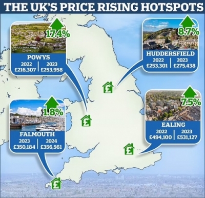പോവിസ്, ഹഡേഴ്സ്ഫീല്ഡ്, ഫാള്മൗത്ത്, ഈലിംഗ് എന്നീ മേഖലകളിലാണ് മറ്റിടങ്ങളില് വില ഇടിയുമ്പോള് നിരക്ക് വര്ദ്ധിച്ചത്. കോണ്വാളിലെ ഫാള്മൗത്തില് 2022 അവസാനം വീട് വില്പ്പന നടന്നത് 350,184 പൗണ്ടിലായിരുന്നുവെങ്കില് കഴിഞ്ഞ വര്ഷം ഇത് 356,561 പൗണ്ടിലേക്ക് ഉയര്ന്നു. രണ്ട് യൂണിവേഴ്സിറ്റികള് ഉള്പ്പെടെ ഈ പോര്ട്ട് നഗരത്തില് സ്ഥിതി ചെയ്യുന്നുണ്ട്. വെസ്റ്റ് ലണ്ടനിലെ ഈലിംഗില് ഒരു വര്ഷം മുന്പ് 494,100 പൗണ്ടായിരുന്ന മൂല്യം 7.5% വര്ദ്ധിച്ച് 531,127 പൗണ്ടിലേക്കും ഉയര്ന്നു. വെയില്സിലെ പോവിസിലാണ് ഏറ്റവും വലിയ വാര്ഷിക വളര്ച്ച രേഖപ്പെടുത്തിയത്. 17.4 ശതമാനമാണ് ഇവിടെ വില കൂടിയത്. 216,307 പൗണ്ട് ആയിരുന്നത് 253,958 പൗണ്ടിലേക്കാണ് വര്ദ്ധിച്ചത്. യോര്ക്ക്ഷയറിലെ ഹഡേഴ്സ്ഫീല്ഡില് ഇപ്പോള് ഒരു ശരാശരി വീടിന് 275,438 പൗണ്ടാണ് വില. മുന് വര്ഷം ഇത് 253,301 പൗണ്ടായിരുന്നുവെന്ന് ഹാലിഫാക്സ് ചൂണ്ടിക്കാണിക്കുന്നു.