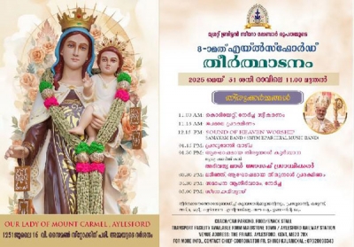 എയ്ല്സ്ഫോര്ഡ്: പരിശുദ്ധ അമ്മ വിശുദ്ധ സൈമണ് സ്റ്റോക്കിന് പ്രത്യക്ഷപ്പെട്ട് നല്കിയ ഉത്തരീയത്തിന്റെ ഉറവിടഭൂമിയായ എയ്ല്സ്ഫോഡില് മെയ് 31 ശനിയാഴ്ച നടത്തുന്ന എട്ടാമത് തീര്ത്ഥാടനത്തിന് വിപുലമായ ഒരുക്കങ്ങള്. കര്മ്മലനാഥയുടെ സന്നിധിയിലേക്ക് ഗ്രേറ്റ് ബ്രിട്ടന് സീറോ മലബാര് രൂപതയുടെ ആഭിമുഖ്യത്തില് നടത്തപ്പെടുന്ന ഈ തീര്ത്ഥാടനം ബ്രിട്ടനിലെ ക്രൈസ്തവ വിശ്വാസികളുടെയും മരിയഭക്തരുടെയും ആത്മീയ സംഗമവേദിയാകും. രൂപതാധ്യക്ഷന് മാര് ജോസഫ് സ്രാമ്പിക്കല് തീര്ത്ഥാടനത്തിന് നേതൃത്വം നല്കും. രൂപതയുടെ ലണ്ടന്, കാന്റര്ബറി റീജിയനുകളും, എയ്ല്സ്ഫോര്ഡ് ഔര് ലേഡി ഓഫ് മൌണ്ട് കാര്മല് മിഷനുമാണ് തീര്ത്ഥാടനത്തിന്റെ ചുമതല വഹിക്കുന്നത്. മെയ് 31 ശനിയാഴ്ച രാവിലെ 11 മണിക്ക് കൊടിയേറ്റ്, നേര്ച്ചകാഴ്ചകളുടെ സ്വീകരണം, തുടര്ന്ന് 11.15 ന് എയ്ല്സ്ഫോര്ഡിലെ പ്രശസ്തമായ ജപമാലാരാമത്തിലൂടെ വിമന്സ് ഫോറത്തിന്റെ നേതൃത്വത്തില് കര്മ്മലമാതാവിന്റെ രൂപവും സംവഹിച്ചുകൊണ്ടുള്ള ഭക്തിനിര്ഭരമായ കൊന്തപ്രദിക്ഷണം നടക്കും. 12.15 ന് SMYM രൂപതാ മ്യൂസിക് ബാന്ഡിന്റെ നേതൃത്വത്തില് ലൈവ് മ്യൂസിക്കല് പെര്ഫോമന്സ്, ഉച്ചക്ക് 1.30 ന് രൂപതാധ്യക്ഷന് മാര് ജോസഫ് സ്രാമ്പിക്കലിന്റെ മുഖ്യ കാര്മികത്വത്തില് രൂപതയിലെ വൈദികരും ചേര്ന്ന് അര്പ്പിക്കപ്പെടുന്ന ആഘോഷമായ വിശുദ്ധ കുര്ബാന, ലദീഞ്ഞ്, തുടര്ന്ന് വിശ്വാസപ്രഘോഷണത്തിന്റെ പ്രതീകമായി വാദ്യമേളങ്ങളുടെ അകമ്പടിയോടുകൂടിയുള്ള ആഘോഷമായ തിരുന്നാള് പ്രദിക്ഷണം എന്നിവ നടക്കും. എയ്ല്സ്ഫോഡില് തീര്ത്ഥാടകരായി എത്തിച്ചേരുന്ന എല്ലവര്ക്കും സ്നേഹക്കൂട്ടായ്മയുടെ ഭാഗമായി സ്നേഹവിരുന്നും ക്രമീകരിച്ചിട്ടുണ്ട്. തീര്ത്ഥാടനത്തോടനുബന്ധിച്ചു തിരുനാള് പ്രസുദേന്തിയാകുന്നതിനും നേര്ച്ചകാഴ്ചകള് സമര്പ്പിക്കുന്നതിനും, കഴുന്ന്, മുടി, എന്നിവ എഴുന്നള്ളിക്കുന്നതിനും അടിമ വയ്ക്കുന്നതിനും കുമ്പസാരത്തിനും പ്രത്യേക സൗകര്യം ഉണ്ടായിരിക്കും. തീര്ത്ഥാടകര്ക്കായി കാറുകളും കോച്ചുകളും പാര്ക്ക് ചെയ്യുന്നതിന് വിശാലമായ പാര്ക്കിങ് സൗകര്യം ഉണ്ടായിരിക്കും. വിമന്സ് ഫോറത്തിന്റെയും SMYM ന്റെയും നേതൃത്വത്തില് മിതമായ നിരക്കില് സ്നാക്ക്, ടീ, കോഫീ കൗണ്ടറുകളും ക്രമീകരിച്ചിട്ടുണ്ട്. കര്മ്മലമാതാവിന്റെ അനുഗ്രഹാരാമത്തിലേക്ക് നടത്തപ്പെടുന്ന തീര്ത്ഥാടനത്തിലേക്കും തിരുക്കര്മ്മങ്ങളിലേക്കും ഏവരെയും സ്നേഹപൂര്വ്വം ക്ഷണിക്കുന്നതായി പില്ഗ്രിമേജ് കോ-ഓര്ഡിനേറ്റര് ഫാ.ഷിനോജ് കളരിക്കല് അറിയിച്ചു. പ്രസുദേന്തി ആകുവാന് താല്പര്യം ഉള്ളവര് താഴെകാണുന്ന ലിങ്കില് രജിസ്റ്റര് ചെയ്യേണ്ടതാണ്. https://forms.gle/wJxzScXoNs6se7Wb6 കൂടുതല് വിവരങ്ങള്ക്ക്: ഫാ. ഷിനോജ് കളരിക്കല് - 07920690343 Address of the Venue: The Friars, Aylesford, Kent, ME20 7BX