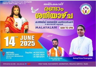 ജപമാല, വി. കുര്ബാന, വചന പ്രഘോഷണം, ആരാധന, ദിവ്യ കാരുണ്യ പ്രദക്ഷിണം എന്നിവ ഉള്പ്പെടുന്ന അഭിഷേകാഗ്നി കണ്വെന്ഷനിലേക്ക്, അഭിഷേകാഗ്നി യുകെ മിനിസ്ട്രിയുടെ നേതൃത്വം ഫാ ഷൈജു നടുവത്താനിയിലും എഎഫ്സിഎം യുകെ കുടുംബവും ഏവരെയും ക്ഷണിക്കുന്നു.