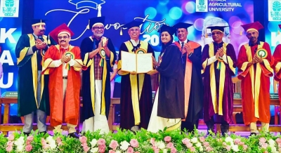 തൃശൂര്: ഭാരതാംബ വിവാദത്തിനിടെ മന്ത്രി പി പ്രസാദിനെ പുകഴ്ത്തി ഗവര്ണര് രാജേന്ദ്ര അര്ലേക്കറുടെ പ്രസംഗം. കേരള കാര്ഷിക സര്വകലാശാല ബിരുദദാന ചടങ്ങിലാണ് മന്ത്രിയെ പുകഴ്ത്തി ഗവര്ണര് സംസാരിച്ചത്. സുഹൃത്ത് എന്നാണ് മന്ത്രിയെ ഗവര്ണര് വിശേഷിപ്പിച്ചത്. മികച്ച ഒരു മന്ത്രിയാണ് പി പ്രസാദെന്നും ഗവര്ണര് പറഞ്ഞു. കാവിക്കൊടിയേന്തിയ ഭാരതാംബ ചിത്രം വിവാദമായതോടെ കാര്ഷിക സര്വകലാശാല ബിരുദദാന ചടങ്ങിലും പ്രതിഷേധങ്ങളുണ്ടാകുമെന്ന് പ്രചാരണങ്ങളുണ്ടായിരുന്നു.