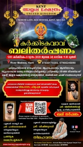 കെന്റ് അയ്യപ്പ ക്ഷേത്രത്തിന്റെ നേതൃത്വത്തില്,ക്ഷേത്ര മേല്ശാന്തി അഭിജിത്തിന്റെ മുഖ്യ കാര്മികത്വത്തില്, പരമ്പരാഗത രീതിയില് ബലി തര്പ്പണചടങ്ങ് നടത്തപ്പെടുന്നു. ബലി തര്പ്പണത്തിന് ശേഷം ഭക്തജനങ്ങള്ക്ക് തിലഹവനം, പിതൃപൂജ തുടങ്ങിയ വഴിപാടുകള് നടത്തുന്നതിനുള്ള അവസരവും സൗകര്യവും ഉണ്ടാവുന്നതാണ്.
