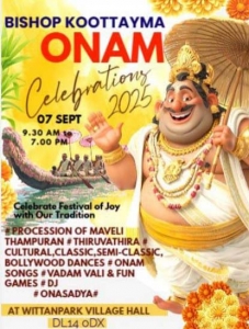 രാവിലെ 10 മണി മുതല് wittan park village ഹാളില് ആരംഭിക്കുന്ന പരിപാടികള് വൈകിട്ട് 7 മണിക്കു ആണ് സമാപിക്കുന്നത്. കൃത്യം 10 മണിക്ക് തന്നെ, നാട്ടില് നിന്നും എത്തിച്ചേര്ന്നിട്ടുള്ള മാതാപിതാക്കള് നിലവിളക്ക് തെളിച്ചു കൊണ്ട് ഉല്ഘാടനം നിര്വഹിക്കുന്ന പരിപാടി തുടര്ന്ന് മാവേലിയെ മന്നനെ വരവേല്പ്പ്, തിരുവാതിര,കുട്ടികളുടെയും,മുതിര്ന്നവരുടെയും വൈവിധ്യമാര്ന്ന കലാപരിപാടികള്, വിഭവ സമൃദ്ധമായ ഓണസദ്യ, വടം വലി, ഓണക്കളികള്,ഫണ് ഗെയിമുകള്, ഡിജെ എന്നിങ്ങനെ വൈവിധ്യമാര്ന്നപരിപാടികളുംആയി സംഘടിപ്പിച്ചിരുന്നു. പങ്കെടുക്കുന്നവര് കൃത്യ സമയത്ത് തന്നെ എത്തി ചേര്ന്നു പരിപാടികള് വമ്പിച്ച വിജയപ്രദം ആക്കുവാന് സഹകരിക്കണമെന്ന് ഓണാഘോഷ കമ്മിറ്റി അറിയിച്ചു പരിപാടി നടക്കുന്ന സ്ഥലം Wiittan park village hall Bishop Auckland DL15 ODX Contact. Jimmy 07737715591 Remith 07470013633 Austin 07824722026