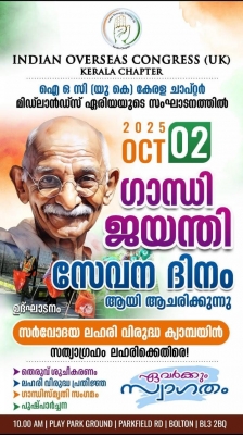 ഐ ഒ സി (യു കെ) - കേരള ചാപ്റ്ററിന്റെ നേതൃത്വത്തില് ഗാന്ധി ജയന്തി ദിനം 'സേവന ദിനം' ആയി ആചരിക്കും. ശ്രമദാനത്തിന്റെ ഭാഗമായി പ്രവര്ത്തകര് ബോള്ട്ടന് കൗണ്സിലുമായി ചേര്ന്നു മാലിന്യം നിറഞ്ഞ തെരുവുകള് ശുചീകരിക്കും. രാവിലെ 10 മണി മുതല് ബോള്ട്ടന് പ്ലേ പാര്ക്ക് ഗ്രൗണ്ടില് വച്ച് സംഘടിപ്പിക്കുന്ന പരിപാടിയില് ജന പ്രതിനിധികള്, സാമൂഹ്യ പ്രവര്ത്തകര്, വിവിധ യൂണിറ്റ് / റീജിയനുകളില് നിന്നുള്ള ഐ ഒ സി പ്രവര്ത്തകര് എന്നിവര് പങ്കെടുക്കും. കേരള ചാപ്റ്റര് പ്രസിഡന്റ് ഷൈനു ക്ലെയര് മാത്യൂസ് ലഹരി വിരുദ്ധ പ്രതിജ്ഞ അംഗങ്ങള്ക്ക് ചൊല്ലിക്കൊടുക്കും.