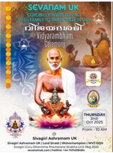 ഈ വരുന്ന ഒക്ടോബര് രണ്ടിന് വ്യാഴാഴ്ച വിജയദശമി ദിനത്തില്, യുകെയിലെ ശിവഗിരി ആശ്രമത്തില് വിദ്യാ സ്വരൂപിണിയായ ശാരദാംബയുടെ തിരുസന്നിധിയില്, കുരുന്നുകള്ക്ക് ആദ്യാക്ഷരം കുറിക്കുവാനുള്ള ദിവ്യാവസരം ഒരുക്കിയിരിക്കുന്നു. സുനീഷ് ശാന്തിയുടെ മുഖ്യകാര്മികത്വത്തില് ചടങ്ങുകള് നടക്കും.