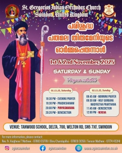 സ്വിന്ഡണ്: സെന്റ് ഗ്രിഗോറിയോസ് ഇന്ത്യന് ഓര്ത്തഡോക്സ് ചര്ച്ച് സ്വിന്ഡന് പരിശുദ്ധ പരുമല തിരുമേനിയുടെ ഓര്മ്മപ്പെരുന്നാള് ഇന്നും നാളെയുമായി ശനി, ഞായര് ദിവസങ്ങളില് നടക്കും. വികാരി വര്ഗ്ഗീസ് ടി. മാത്യു മുഖ്യകാര്മ്മികനാകും. ഇന്ന് വൈകുന്നേരം 6:30ന്  സന്ധ്യാനമസ്കാരവും തുടര്ന്ന് റാസ, ഗായകസംഘത്തിന്റെ നേതൃത്വത്തില് പുണ്യസ്മരണ, ആശീര്വാദം ഉണ്ടായിരിക്കുന്നതാണ്. നാളെ (ഞായര് 2 നവംബര്) രാവിലെ 8:45ന് പ്രഭാത നമസ്കാരവും തുടര്ന്ന് വി കുര്ബാനയും ഉച്ചയ്ക്ക് 12 മണിയ്ക്ക് നേര്ച്ചയോടെ സമാപിക്കുകയും ചെയ്യും. ഏവരെയും പെരുന്നാള് ശുശ്രൂഷയിലേക്ക് ക്ഷണിക്കുന്നു.
