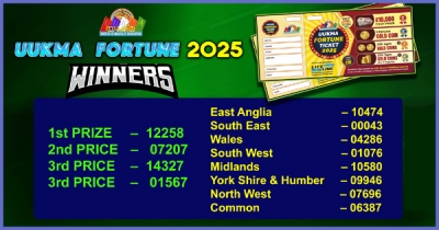 യുക്മ ഫോര്ച്യൂണ് ബംബര് 2025 ലോട്ടറിയുടെ നറുക്കെടുപ്പ് പതിനാറാമത് യുക്മ - ലൈഫ് ലൈന് ദേശീയ കലാമേള വേദിയില് വച്ച് നടത്തപ്പെട്ടു. കലാമേളയുടെ ഉദ്ഘാടനവും സമ്മാനദാനവും ഉള്പ്പടെ നടത്തിയ പ്രധാന വേദിയില് വച്ചാണ് യുക്മ ഫോര്ച്യൂണ് ലോട്ടറിയുടെ നറുക്കെടുപ്പും നടത്തിയത്. നറുക്കെടുക്കപ്പെട്ട നമ്പരുകള് ഇതോടൊപ്പം പ്രസിദ്ധീകരിക്കുന്നു. വിജയികളായവരുടെ കൂടുതല് വിവരങ്ങള് പിന്നീട് പ്രസിദ്ധീകരിക്കുന്നതാണ്.