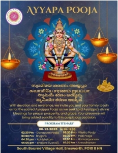 ഹാംപ്ഷയര് ആന്റ് വെസ്റ്റ് സസെക്സ് ഹിന്ദു കള്ച്ചറല് സൊസൈറ്റിയുടെ അയ്യപ്പപൂജ ഡിസംബര് 6ന് നടക്കും. ഗണപതി പൂജ, ഭജന, അഭിഷേകം, വിളക്ക് പൂജ, പടിപൂജ, അന്നദാനം എന്നി പൂജകളും പരിപാടികളുടെ ഭാഗമാകും. ഉച്ചക്ക് 2.30 മുതല് രാത്രി 7.30 വരെയാണ് പൂജകള് നടക്കുക.