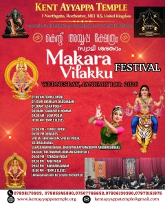 ഇംഗ്ലണ്ടിലെ കെന്റ് അയ്യപ്പ ക്ഷേത്രത്തില് മകരവിളക്ക് മഹോത്സവം ഭക്ത്യാദരപൂര്വം ആഘോഷിക്കുന്നു. 2026 ജനുവരി 14-ാം തീയതി ബുധനാഴ്ച യാണ് ആഘോഷം. അയ്യപ്പ ഭക്തര്ക്കായി സമ്പൂര്ണമായ പൂജാ-ആചാരങ്ങളും സാംസ്കാരിക പരിപാടികളും സംഘടിപ്പിച്ചിരിക്കുന്നു.രാവിലെ 7.00 മണിക്ക് നട തുറക്കലോടെയാണ് മഹോത്സവ ചടങ്ങുകള് ആരംഭിക്കുന്നത്. തുടര്ന്ന് 7.10 ന് നിര്മാല്യ ദര്ശനം, 7.30 ന് ഉഷപൂജ,8:00 ന് ഗണപതി ഹോമം, 9.00 ന് ഉച്ചപൂജ എന്നിവ നടക്കും. 9.30 ന് നട അടയ്ക്കും.