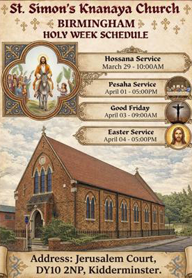 ബര്മിങാമില് സെന്റ്: സൈമണ്സ് ക്നാനായ ഇടവക സ്വന്തമായി വാങ്ങിയ പുതിയ പള്ളിയില് വെച്ച് ഈ വര്ഷത്തെ ഊശാന, പെസഹ, ദുഃഖവെള്ളി, ഈസ്റ്റര്, ശുശ്രൂഷകള് നടത്തപ്പെടുന്നു. ശുശ്രൂഷകള്ക്ക് വികാരി ഫാ: സജി എബ്രഹാം കൊച്ചേത്ത് മുഖ്യകാര്മികത്വം വഹിക്കും.