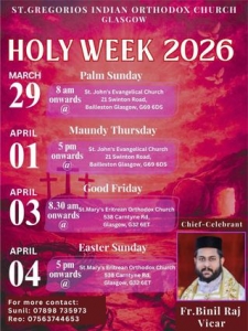ഈ വര്ഷത്തെ ഹാശാ ആഴ്ച ശുശ്രൂഷകള്ക്ക് റവ. Fr. Binil Raj നേതൃത്വം നല്കുന്നതാണ്.കര്ത്താവിന്റെ ജറുസലേമിലേക്കുള്ള രാജകീയ പ്രവേശനത്തിന് മുന്നോടിയായുള്ള ഓശാന ശുശ്രൂഷകള് മാര്ച്ച് 29 തീയതി ഞായറാഴ്ച രാവിലെ എട്ടര മണി മുതല് ഗ്ലാസ്ഗോയില് ഉള്ള