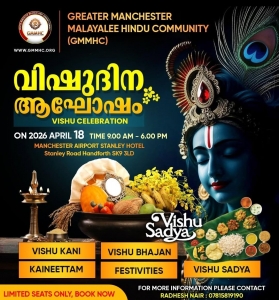 മാഞ്ചസ്റ്റര്: ഗ്രേറ്റര് മാഞ്ചസ്റ്റര് മലയാളി ഹിന്ദു കമ്മ്യൂണിറ്റിയുടെ (GMMHC) ആഭിമുഖ്യത്തില് നടത്തുന്ന 2026-ലെ വിഷു മഹോത്സവം ഏപ്രില് 18 ശനിയാഴ്ച ആഘോഷിക്കും. ഹാന്ഡ്ഫോര്ത്തിലെ മാഞ്ചസ്റ്റര് എയര്പോര്ട്ട് സ്റ്റാന്ലി ഹോട്ടലില് (Stanley Road, SK9 3LD) വെച്ചാണ് വര്ണ്ണാഭമായ ആഘോഷ പരിപാടികള് അരങ്ങേറുന്നത്.