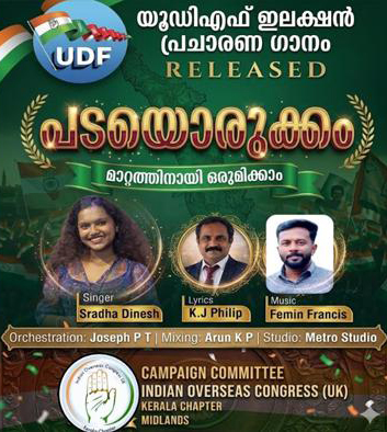 മിഡ്ലാന്ഡ്സ്: കേരള നിയമസഭ തെരഞ്ഞെടുപ്പിനെ മുന്നില്ക്കണ്ട് യുഡിഎഫ് സ്ഥാനാര്ഥികളുടെ വിജയത്തിനായി ഇന്ത്യന് ഓവര്സീസ് കോണ്ഗ്രസ് (യുകെ) കേരള ചാപ്റ്റര് മിഡ്ലാന്ഡ്സ് ക്യാമ്പയിന് കമ്മിറ്റി തയ്യാറാക്കിയ പ്രചാരണ വീഡിയോ ഗാനം പുറത്തിറങ്ങി. ''പടയൊരുക്കം മാറ്റത്തിനായി ഒരുമിക്കാം'' എന്ന ആശയവുമായി പുറത്തിറങ്ങിയ ഈ ഗാനം സോഷ്യല് മീഡിയ പ്ലാറ്റ്ഫോമുകളില് ഇതിനോടകം ശ്രദ്ധ നേടിക്കഴിഞ്ഞു.